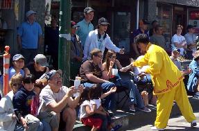 法轮功学员有的打着“法轮大法好”,“真、善、忍”等横幅;有的为观众演示五套功法;还有的向观众派发真象资料。