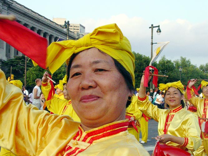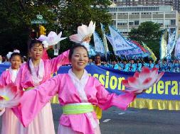 法轮大法学员的队伍由三个方阵组成,两个巨型横幅“法轮大法――打坐身心修炼”,“世界需要真善忍”开头,十二个穿着鲜艳的中国传统服饰的女学员表演舞蹈荷花舞,紧随其后的是蓝、黄色系的气势不凡的旗鼓阵。整个队伍色彩缤纷、充满了喜庆、祥和。