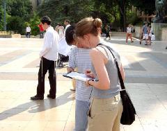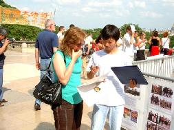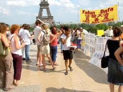 前来观赏埃菲尔铁塔的各国游客络绎不绝,但他们很快就被法轮功学员们在烈日下洪法体现出的庄严神圣所吸引。有许多人排着队要求签名声援反迫害,也有些人不顾天气炎热要求当场学功。学员们一一满足了他们的愿望,还与口渴的游客分享我们已经所剩无几的水。在短暂而又漫长的一下午,很多人亲手签下了他们的名字和他们支持法轮大法的善心。