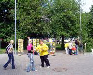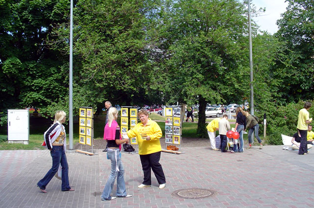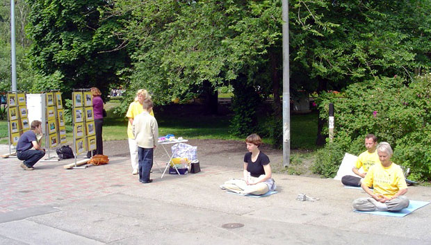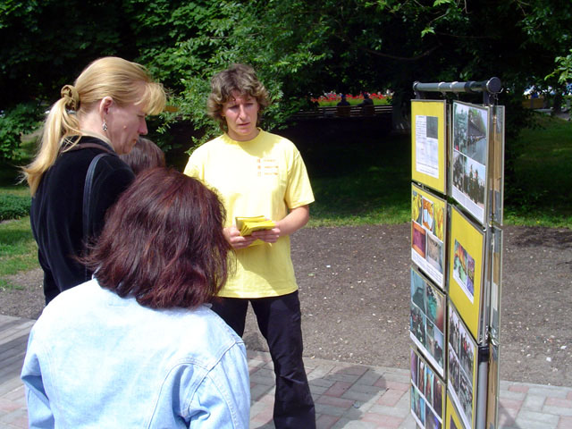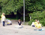 人们声讨着中共对法轮大法的迫害,很多人都想学功,一个7岁的男孩在活动后也不愿意离开,非要学员们马上就教会他炼功。他模仿着学员完成了所有5套功法。