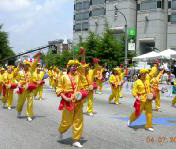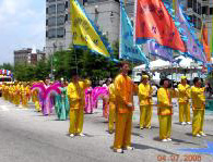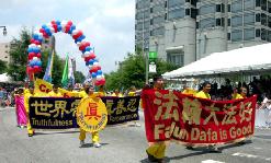 今年最为突出的亚裔团体代表仍然是法轮功队伍。来自美东南几个州的法轮功学员纷纷驱车在前一天下午长途赶来,有些要开车7~8个小时,刚刚到达,就不顾旅途疲劳和夏季南方的炎热,马上投入整队、排练。