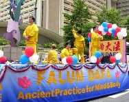 法轮功学员在花车上演示功法
