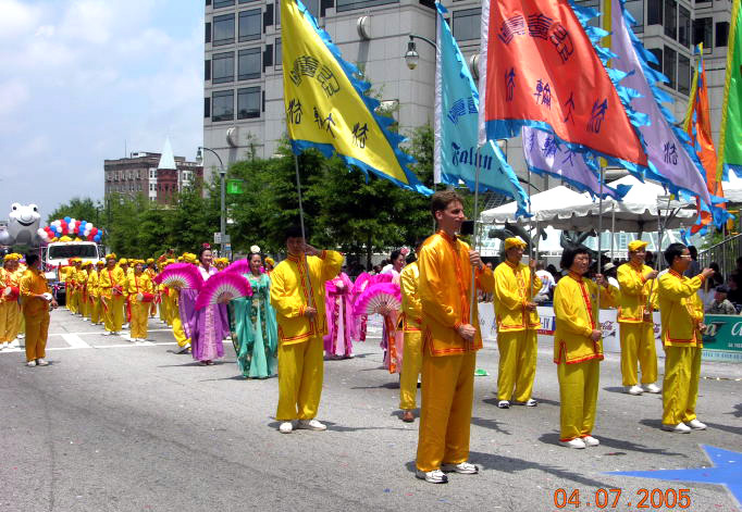 法轮功队伍由两位手捧花篮的仙女在前面开道;紧跟着的是闪闪发光的“法轮大法”匾额和横幅;后面的旗阵、腰鼓阵、唐朝仕女队和花车尾随而来;学员们在花车上演示功法。