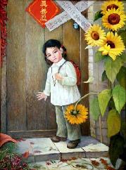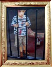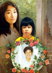 This painting is entitled “Come Back Daddy”。 The young girl is called Fadu. Her dad was arrested by the communist government and was tortured to death, only because he practised Falun Gong. Fadu’s mum was so sad her hair turned white overnight. Since then, Fadu and her mum, who now live in Australia, have traveled around the world to call on kind-hearted people to help end the killing and persecution in China。