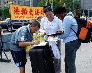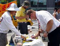的真象。这里地理位置优越, 虽然当天气温高达华氏八~九十度,但经过的人群络绎不绝。人们为迫害真象所震惊,纷纷签名支持反迫害。