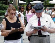 【明慧网2005年8月11日】2005年8月6日星期六早上,我们一行十二名加拿大多伦多法轮大法弟子赶到纽约曼哈顿中城59街和8大道交界处的哥伦布圆环处,向人们讲述发生在中国大陆对法轮功残酷