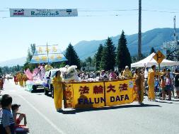 ![]() 斯诺阔米小城里的人们喜闻大法 | ![]() 首次参加斯诺阔米市游行的法轮功队伍 |