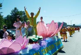 ![]() 花车上的功法演示展现了法轮大法的美好 | ![]() 法轮功的队伍赢得斯诺阔米市游行花车第一名 |