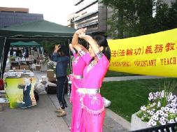 当天,学员们在广场上摆放了一个包括有韩国语真象材料的摊位。许多人停下来接受真象材料并询问法轮功功法。二名年轻女士对学炼法轮功非常感兴趣,当她们了解到她们居家附近就有炼功点时,露出了高兴的微笑。