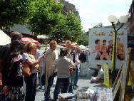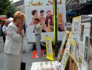 这里有一条步行街,两边摆满了各种生意摊位,川流不息的人群在争相选购自己喜爱的物品。突然一个人说,听啊!多么美妙的音乐,好象从天宫中飞来的。人们顺着音乐声寻找到了播放音乐的法轮功摊位。首先映入人们眼帘的是法轮功学员正伴随着这美妙祥和的音乐演示着五套功法,人们停住脚步全神贯注的观看。一个人感叹的说:好美的音乐!但当人们又看到揭露法轮功学员在中国遭受酷刑的展板时,他们震惊了。有的说,太恐怖了!太惨了!在21世纪今天竟然还出现这么惨烈的事情,这是真的吗?学员们说,这些受迫害者都是有名、有姓、有地址的,而揭露出的这些还只是冰山一角,还有大量的迫害真象被中共掩盖、封锁着。