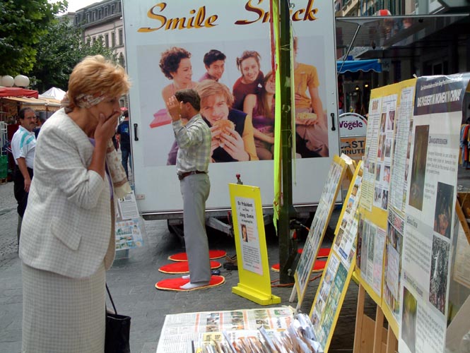 这时周围很多人都围过来听这位学员的介绍,这两位女士说,“江××真坏。我们用什么方法能帮助你们呢?”人们有的坚持要捐钱给法轮功,被学员婉言谢绝。学员说,请您用您的善心在营救这位瑞士留学生的母亲的表格上签名吧,她只因炼法轮功,要做好人,就被无理的关进监狱。这时大家都纷纷签名,那两位女士一再谢谢学员为她们详细介绍了法轮功,并说“你的耐心使我们很感动,使我们真正的了解了法轮功,今天我们头一次遇到这一群好人,法轮功真了不起,你们真伟大。”学员说,“是我们的大法伟大。请记住法轮大法好!真善忍好!”两位女士走前不仅带走了真象材料,还签名支持营救被迫害的法轮功学员。