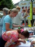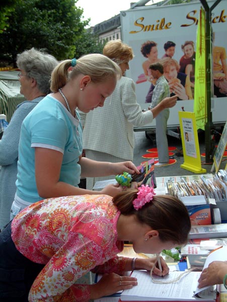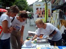 这天出现了不少全家来到法轮功摊位,全家签名支持法轮功的动人情景。其中一个家庭的主人,带领全家老小找到法轮功摊位,见到学员第一句就说,“可找到你们了,我们全家都流着眼泪看完了你们给的真象光盘,实在是太惨了。那么多的好人被酷刑虐杀了,那么好的功法被中共禁止了,中国如此没有人权,没有信仰自由,使人难以容忍,我们全家都想帮助法轮功。请问我们怎么才能帮你们呢?”学员说,请您用您的善心签名支持营救这位瑞士留学生的母亲,并将你们知道的法轮功真象告诉您的亲朋好友,帮助呼吁制止迫害法轮功,这就是对我们最大的帮助。她们一一答应,并都签了名,走前还祝法轮功好运,祝法轮功胜利!