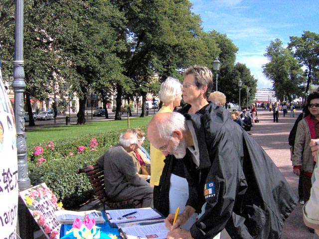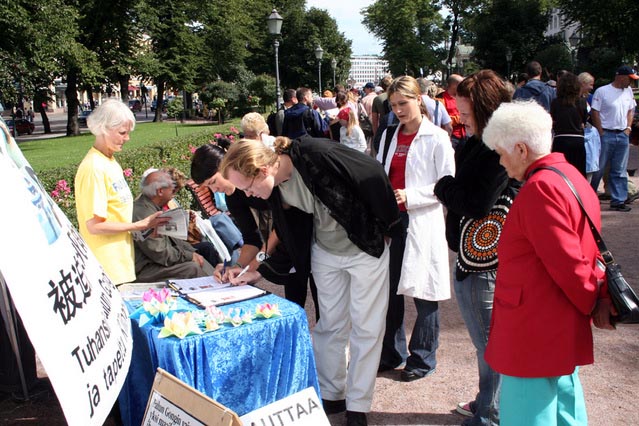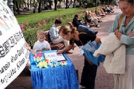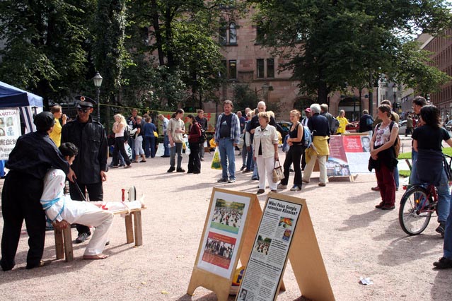 2005年8月12日,正值世界田径锦标赛在芬兰首都赫尔辛基(Helsinki)市举办期间,来自芬兰、拉脱维亚、瑞典及挪威的部分法轮功学员,在赫尔辛基市中心公园向来自世界各国的游客和媒体,以真人模拟演示酷刑的方式,揭露江和中共恶党对修炼真善忍的法轮功学员长达六年之久的残酷迫害,呼唤世人的良知善念,共同制止迫害。