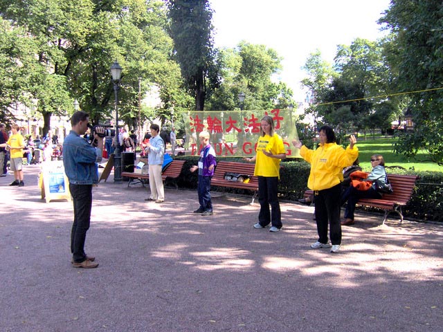 世锦赛期间赫尔辛基游人如织,热闹非凡,此公园内就设有五、六种表演。法轮功学员的展示场地位于公园中心,触目惊心的模拟酷刑演示和祥和的功法表演吸引了大批游客驻足观看。