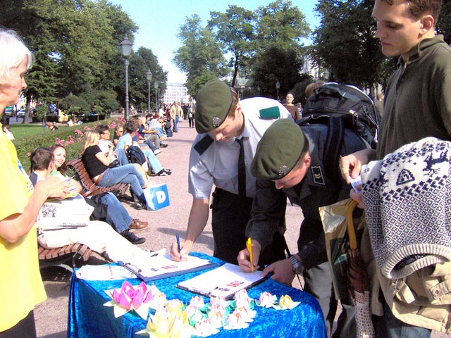 两位瑞典人问法轮功学员为什么在这里,这些(指被迫害致死的学员遗像)都是中国人吗?当得知原因并知道这些学员们来自几个不同国家时,他们说,你们做得很好。他们还说,西方社会的政府对迫害不作出反应,是因为经济利益问题,这是不对的。