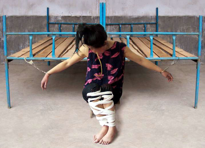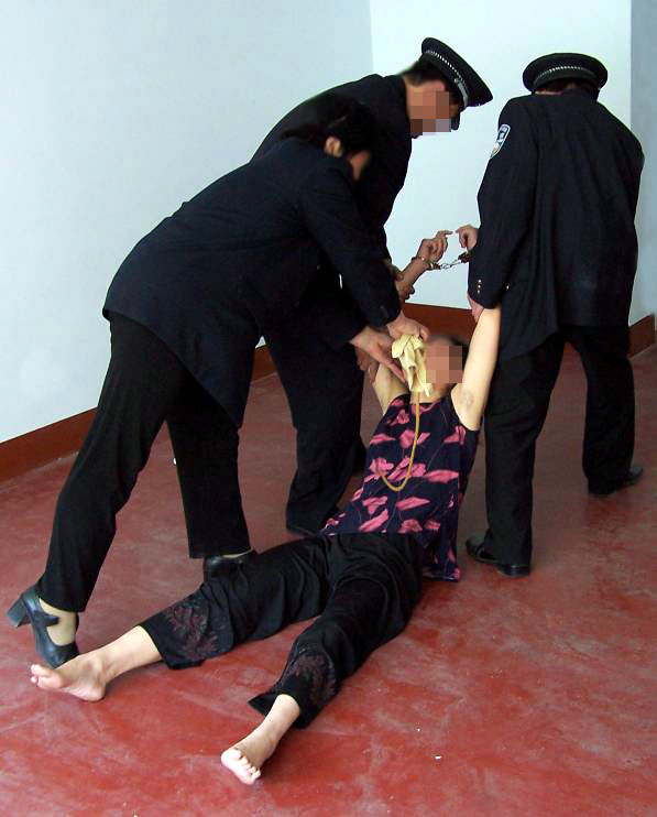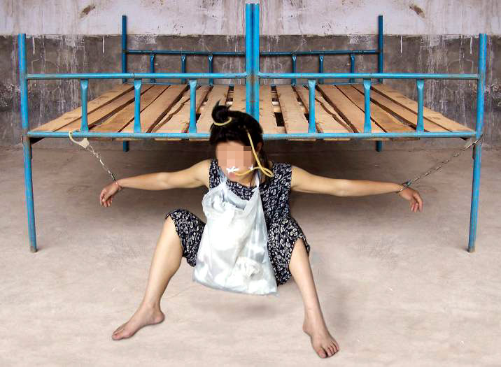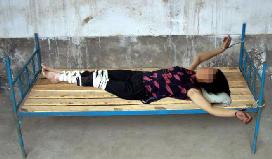 后来江静又被恶警们每天24小时身体成大字形捆铐在床上近一个月。腿常常用约束带固定捆绑在床上,看到江静弄开了捆绑腿的绳子,她们就又狠劲的给她重新捆绑。