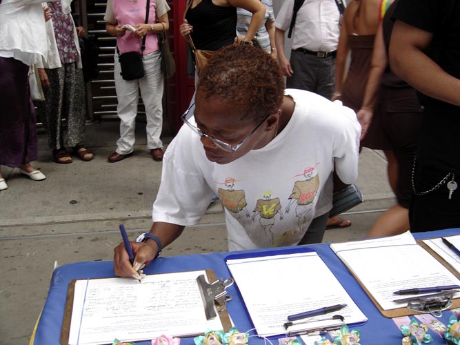 ![]() 曼哈顿42街上的反酷刑展 | ![]() 曼哈顿42街上的反酷刑展 | ![]() 签名支持反迫害的民众 |