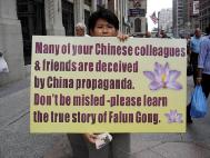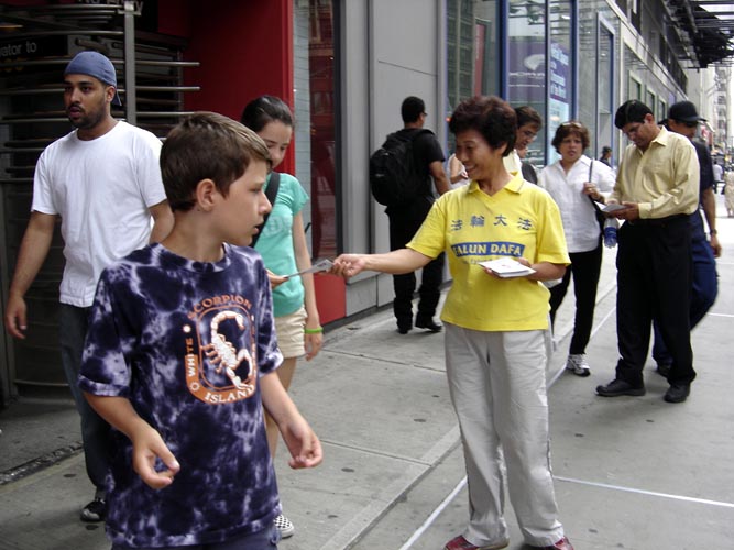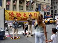 一位能说英文的曾姓小学教师表示:在曼哈顿讲真象十分迫切,这个暑假是他第三次来曼哈顿,因为这里是世界金融中心,有许多大公司在中国有投资,这里的公司都有中国人在那里工作,他们被中共操控的媒体所蒙蔽,对法轮大法有不好的认识,影响到在公司里的其他同事。他们投资到大陆的钱,被用来支持中共迫害大陆善良的老百姓,尤其是中共对修“真、善、忍”的法轮功学员的迫害手段更为残暴。