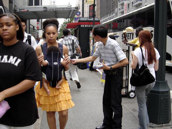 学员们利用一周或两周的时间,长者停留一个月、两个月甚至半年,吃住自费,省吃俭用,停留较长期的几个人合租房子,白天到曼哈顿街头讲真象,晚上回来做饭吃,无论寒冬酷暑每天照样出门,把握在这里的每一刻,希望把法轮大法的美好和在中国被迫害的真象带给每一个在曼哈顿的有缘人。