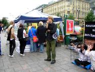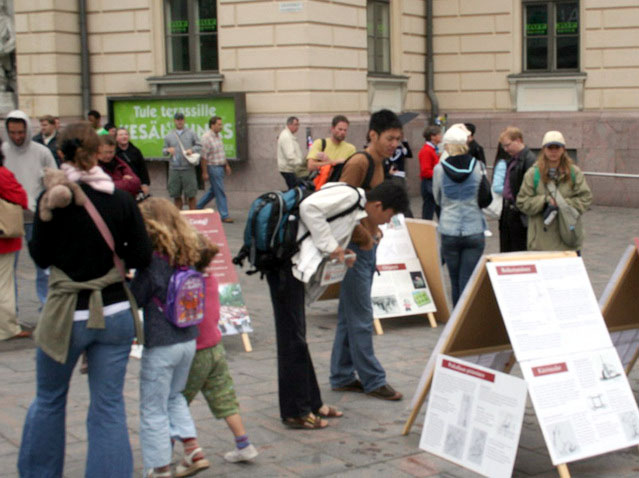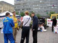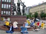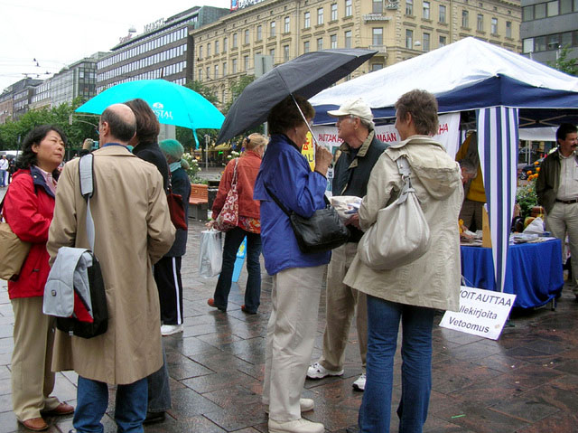 【明慧网2005年8月21日】2005年8月14日,部份来自北欧和拉脱维亚的法轮功学员在芬兰首都赫尔辛基最繁华的商业街中心,以表演法轮功功法和举办反酷刑展等形式,向人们介绍法轮功并揭露在中国法轮功学员遭受迫害的事实。各国游人纷纷在呼吁制止迫害的征签簿上签名,以示对法轮功学员的支持和对这场迫害的谴责。