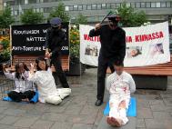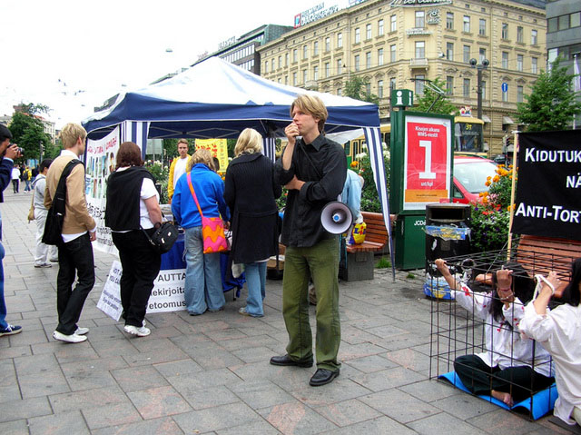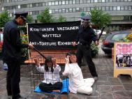 该日的赫尔辛基,阴雨连绵,在这里举办的2005年世界田径锦标赛已進入尾声。然而,在反酷刑展周围,一批批的人在围观。他们中有芬兰人,也有来自各国参加世锦赛的代表团成员和游客。从他们惊奇的表情,愤怒的眼光、同情的泪水和果断的签名中,可见他们的内心在产生着震动。一端是祥和的功法表演,一端是残暴的酷刑展示,两者形成鲜明的对比。