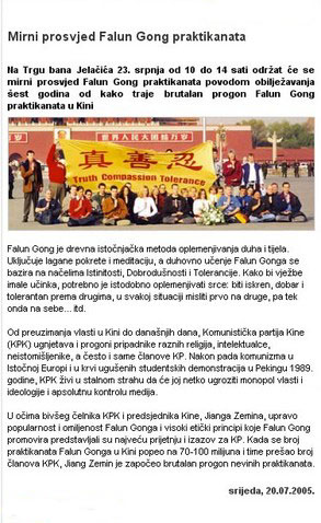 文章表示,法轮功受到中国民众的欢迎与尊敬,修炼人数达七千万至一亿,前国家主席江氏及中共出于妒忌,开始残酷的镇压这些和平的人们。