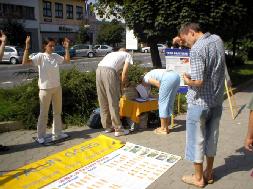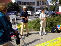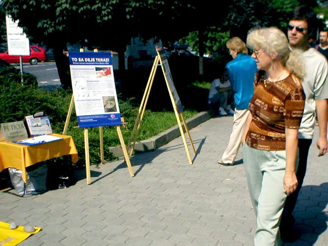 学员们在市中心放置了真象展板和横幅,并示范法轮功功法。展板上的海报揭示了发生在中国长达六年的对法轮功的残酷迫害。