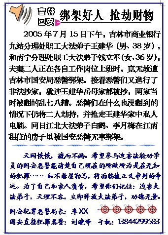 2005年7月15日下午,吉林市商业银行九站分理处职工大法弟子王建华(男、38岁),和南宁分理处职工大法弟子钱立军(女、36岁),夫妻二人正在各自工作岗位上班时,竟无故遭吉林市国安局恶警绑架。接着恶警们又進行了非法抄家,就连王建华岳母家都被抄,两家当时被翻的乱七八糟。恶警们在什么也没翻到的情况下仍将二人劫持,并抢走王建华家中私人电脑。