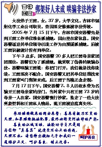 7月17日下午,吉林市国安恶警多人以收水费为名骗开王茵母亲家的房门,当时家中只有王茵70多岁的母亲一人在家。国安恶警强行抄家,抢走了一些大法真象资料,后王茵被迫流离失所。