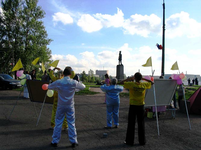 虽然庆祝活动下午3点才开始,但一大早一部份学员就来到了这里,他们顶着绵绵细雨到市政府和图书馆书店等处介绍法轮功,赠送资料。中午12点,大家在涅瓦河港口的彼得大帝雕像旁边摆上展板,开始了炼功、解说、发资料等一系列活动。下午,天气放晴,市民们涌上街头庆祝节日,到处都是热闹场面,学员们分头到各处发送资料,使得大批民众得闻法轮功真象。