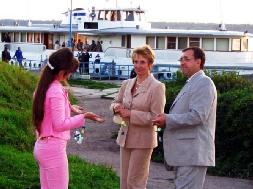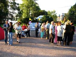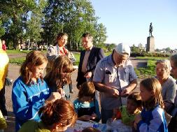 下午5点,法轮功学员摆放展板的地方突然来了大批警察,开始清场戒严,原来是参加节日庆祝的该地区各城市的行政长官们要从这里登船游览拉德加湖。通过向警官们讲真象,法轮功学员和真象展板被批准留在了戒严区内,而所有游人则被请到戒严区以外。很快政府车队就到了,20多位行政长官和随行人员从车里出来,向岸边的游船走去,而真象展板恰好就在他们的必经之地,于是官员们纷纷在展板和正在炼功的法轮功学员们前面停下脚步,几位学员迎上去,向他们面对面介绍法轮功以及发生在中国大陆的迫害真象并赠送资料……