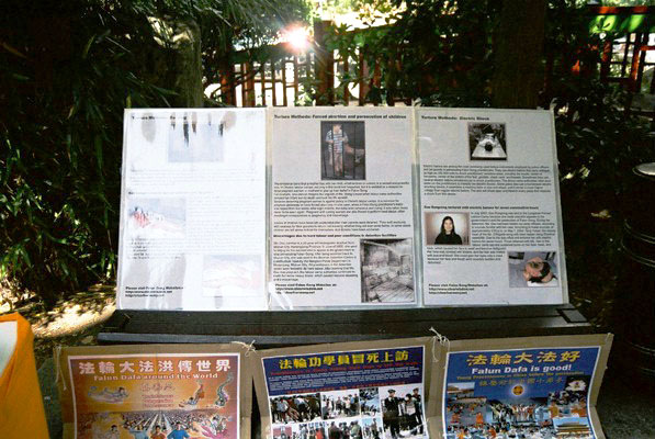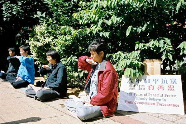祥和的炼功场面,吸引了许多来往的中国人驻足观看。许多人接过传单阅读真象。一位走在马路对面的中国妇女,站在马路对面模仿着学员的炼功动作,一比一划的做了起来。之后,她拿了真象资料仔细阅读。还有一位中国人,他告诉学员他也学法轮功,并且自己炼了几年了。