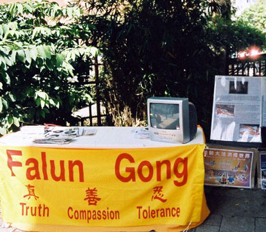 学员们布置好展台、真象资料和图片,还用一台小电视机向行人播放真象VCD《风雨天地行》。