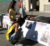 一位女士说她听说过法轮功,她在旧金山中领馆前见到学员在那里请愿,但她不明白为什么中共要迫害法轮功。学员告诉她,中国有上亿的人炼法轮功,当时的中共头目江××出于妒忌镇压法轮功,已经有将近3000名法轮功学员被迫害致死。她听后表示,希望法轮功能够最终获胜。