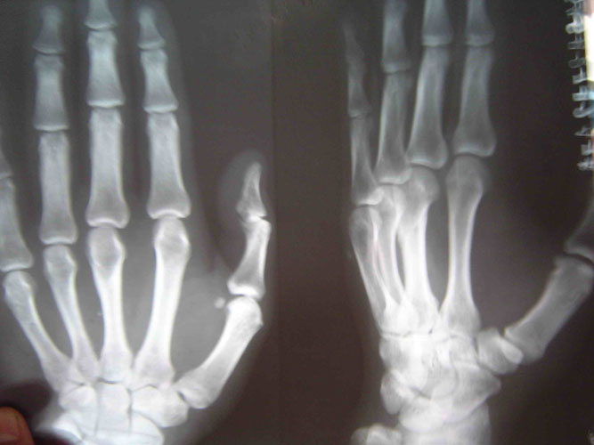因为剧痛,邢加秋挣脱用手去挡,抬起的手却被犯人李素安抡了一棒,邢眼前一黑晕了过去,不法犯人们又把他打醒,强制他站起来,这时,邢加秋的手背肿得象个馒头,手心青紫,不能动,感觉骨头象断了一样。第二天,犯人李素安、犯人金永军说邢加秋罚站时动摇,对他又一顿毒打,李素安阴险地冲着邢加秋受伤的手砍了一掌,邢大叫一声痛得坐在地上,此后邢家秋的手剧烈疼痛不敢动。(2005年6月在沈阳第一监狱拍的X光片子显示邢加秋左手中指骨折)
