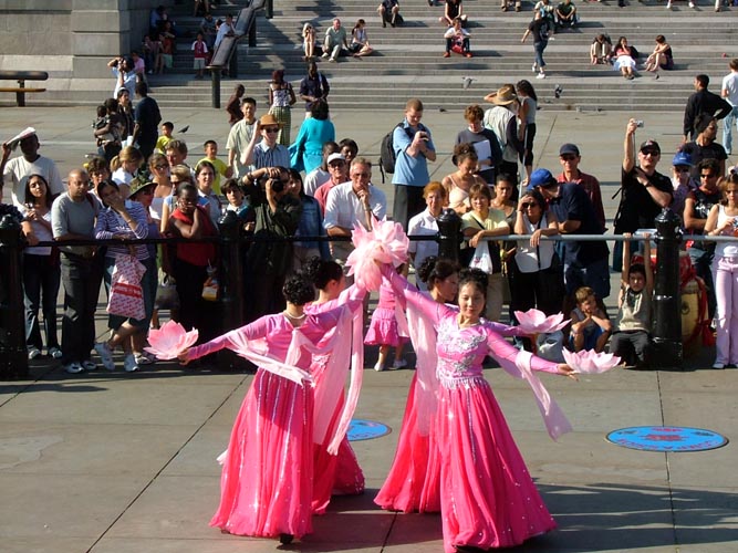 在表演期间,经常有一些中国游客在广场上来来往往,当他们看到学员们正在演出时,也停下了脚步,成为了观众。发真象材料的学员,上前与他们交谈,绝大多数的中国游客,接受了真象材料,有些人耐心的听学员们的讲述。