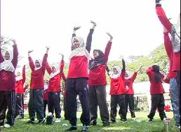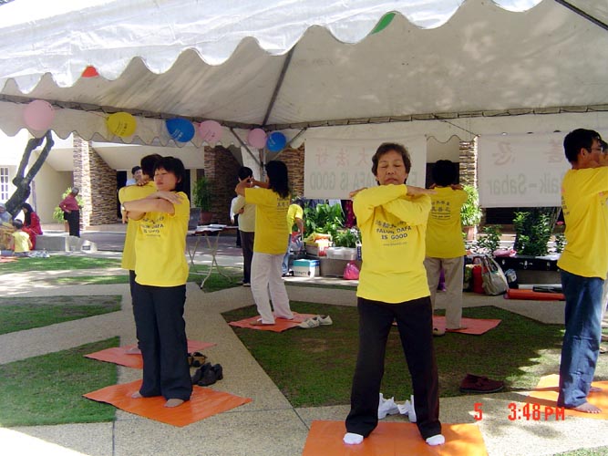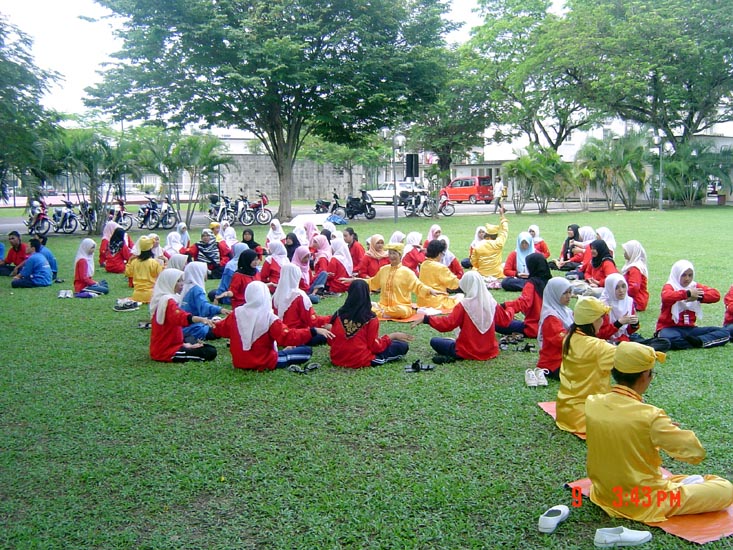 值得一提的是,学校在最后一天下午安排的“全体运动”,特别选择了法轮功作为主要运动以替代往年快节奏的健身操。当天下午3点,为数10人的腰鼓队出场了,他们从一个停驻点游行至草场,阵阵鼓声伴着音乐响遍校园。接下来“全体运动”开始了,身着显眼服装的法轮功学员带动着百位以上大学生一起炼功。炼功示范过后,一些学生意犹未尽,要求增加炼功时间,得到校方允许,学员把他们分成小组继续教他们,气氛融洽和井然。