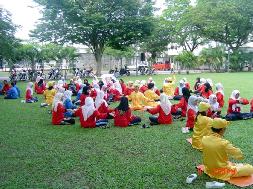 ![]() 腰鼓队出场 | ![]() 分成小组炼功 |