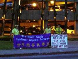 【明慧网2005年9月11日】9月8日,希尔顿夏威夷村庄大酒店门口,夏威夷法轮功学员进行了和平请愿,他们向欢迎人群和到访客人们的车队展示了横幅和标语,上面写着“世界需要真善忍”和“中国必须停止谋杀、拷打和强奸法轮功学员”。