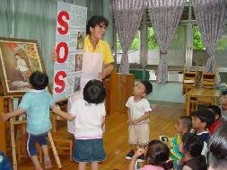 征签活动的第二站是弘育幼儿园,该园的小朋友大多学炼过法轮功,知道法轮功“真、善、忍”是好的,有一个小女生在看完影片后一直哭,直说为什么警察要打死她们?为什么要把她们关起来?她不明白?很多孩子更围着学员问,想不通为什么警察要抓他们,打他们?幼儿园许园长和老师们见状都忙着帮助讲真象,孩子们在听明白了真象后,都很认真的签名或在征签布条上作画,深怕美国总统布什不明白她们的心意。