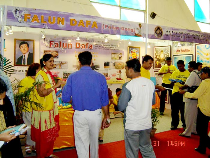 十名斯里兰卡的学员和来自印度孟买,海德拉巴和本格拉等城市的学员也参加了书展。学员们巡回在大展厅开阔的地方演示功法,派发传单。9天的书展期间,学员每天都派发出数千张英文和印度语的传单。这是让人们了解法轮大法,并向他们讲清真象的好机会。许多人想知道,为什么在这个充满商业气息的书市上,我们却向他们提供了这么有益的东西,而且还是免费的。