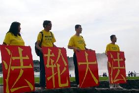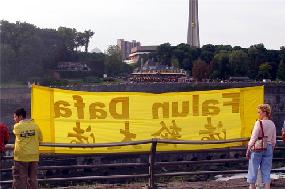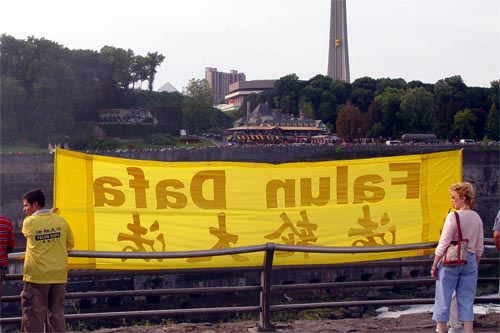 【明慧网2005年9月13日】9月10日下午,几位美国法轮功学员和加拿大学员前往尼亚加拉大瀑布,向胡锦涛和到访的中共官员呼吁停止迫害法轮功,在胡和官员下车的门前,竖着“法轮大法”的旗子,有的同修一人举着两个酷刑图片,与胡仅几步之遥。