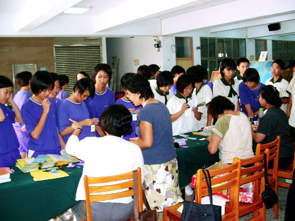 ![]() 参观者由导览解说,了解每幅作品背后的真实、感人故事 | ![]() 学生们特别喜欢小莲花,在现场学习制作 |