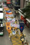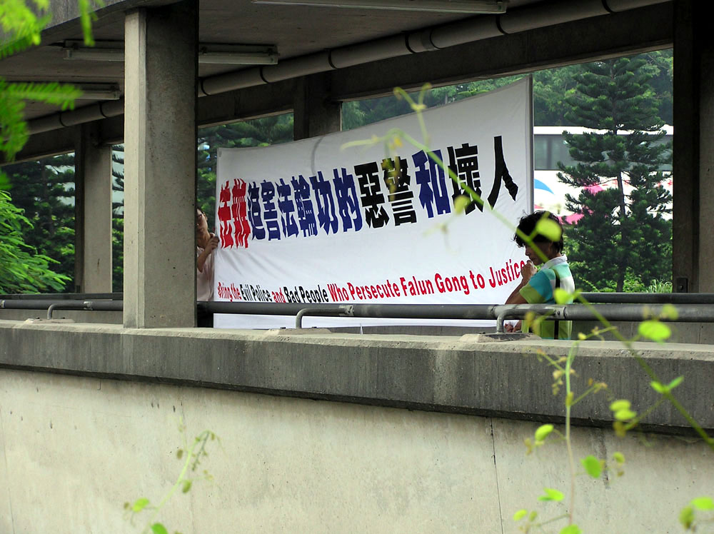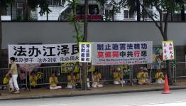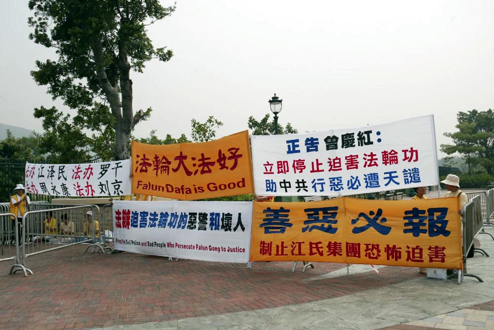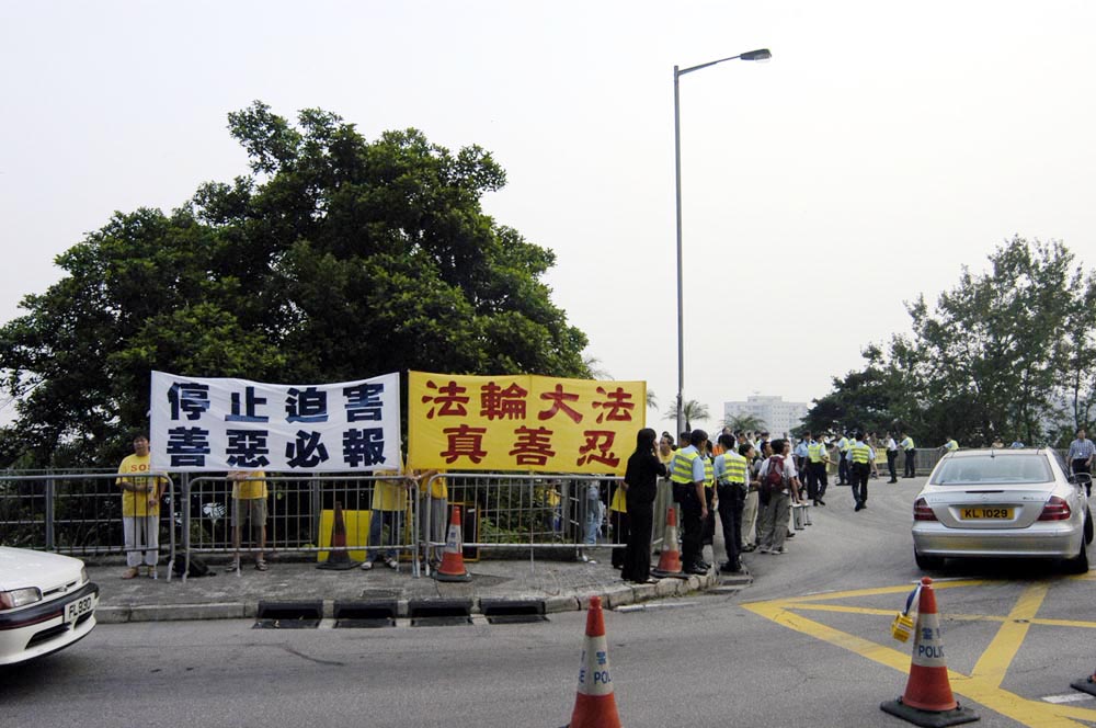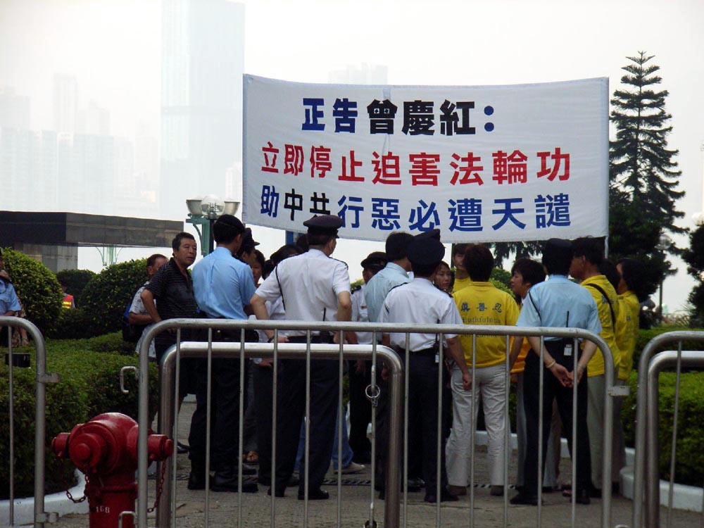 ![]() 9月10日下午,曾某车队刚进入香港,法轮功学员在落马洲一条人行天桥上拉起抗议横幅。 | ![]() 9月10日傍晚,学员在香港特首设宴招待曾某的官邸外,静坐抗议。 |
