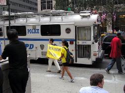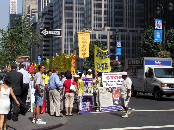 【明慧网2005年9月14日】(明慧记者采菊纽约报道)2005年9月13日下午胡锦涛抵达纽约,法轮功学员在联合国和胡下榻的沃道夫酒店前进行了阵容强大的和平请愿。
