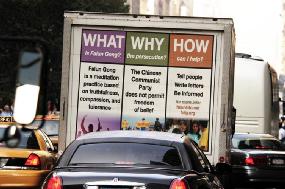 为了更好的让有缘人了解真象,法轮大法弟子们还特地组织了约35辆U-Haul,分别在左右侧和后面装点上中英文法轮功真象的横幅,有“法轮大法好”,“ 真善忍好”,“停止迫害法轮功”,“胡锦涛:神和人民给你的时间是有限的”,”法办江泽民 罗干 刘京 周永康”,“法办迫害法轮功的恶警和坏人”等,U-hall在大街上来来回回的行驶,是一幅别致醒目,流动而又静止的画面。