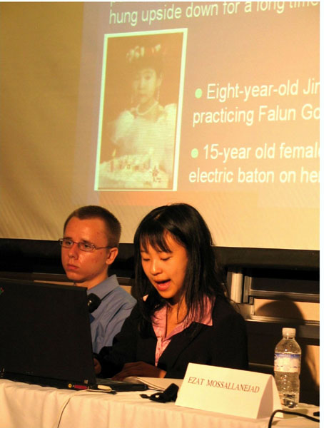 全球营救的青年总裁凯莉(Kelly)讲述了中共迫害法轮功对中国上千万儿童造成的精神、肉体和社会方面的伤害。在社会方面的伤害包括在校学生被迫接受诋毁法轮功的宣传教育,如不参与将无法毕业,煽动不明真象的学生对法轮功的仇恨,学生被迫参与所谓的“百万签名”运动。在肉体伤害方面,许多修炼法轮功的学生、儿童被员警殴打折磨。凯莉介绍说,一个11岁的男孩被员警抓起再扔到地上,男孩不断哭泣,员警就重击男孩的脸,导致男孩立即失聪。在精神方面,法轮功学员的孩子在社会上受到广泛歧视,包括被迫弃学、威胁、恐惧以及失去父母的巨大精神伤害。一个15岁的男孩因无法承受同学们的诬蔑和造谣而服毒自杀。法轮功学员的家庭经常被勒索,仅5个月大的盈盈的父母就被勒索超过2000元人民币。凯莉最后谈到许多中国儿童因父母修炼法轮功被中共迫害致死而成为孤儿的案例。