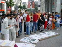 【明慧网2005年9月16日】2005年9月10日,来自比利时和荷兰的法轮功学员在安特卫普(Antwerp)市举办了真人反酷刑展,揭露六年前由前中共领导人江泽民发起的,至今仍在继续的对法轮功学员的迫害