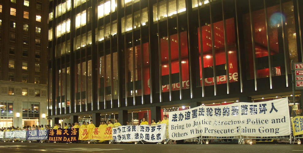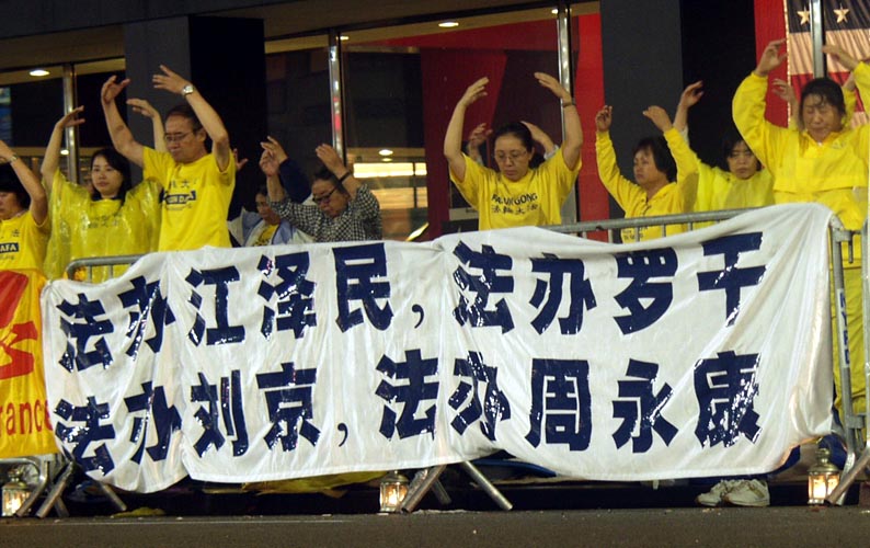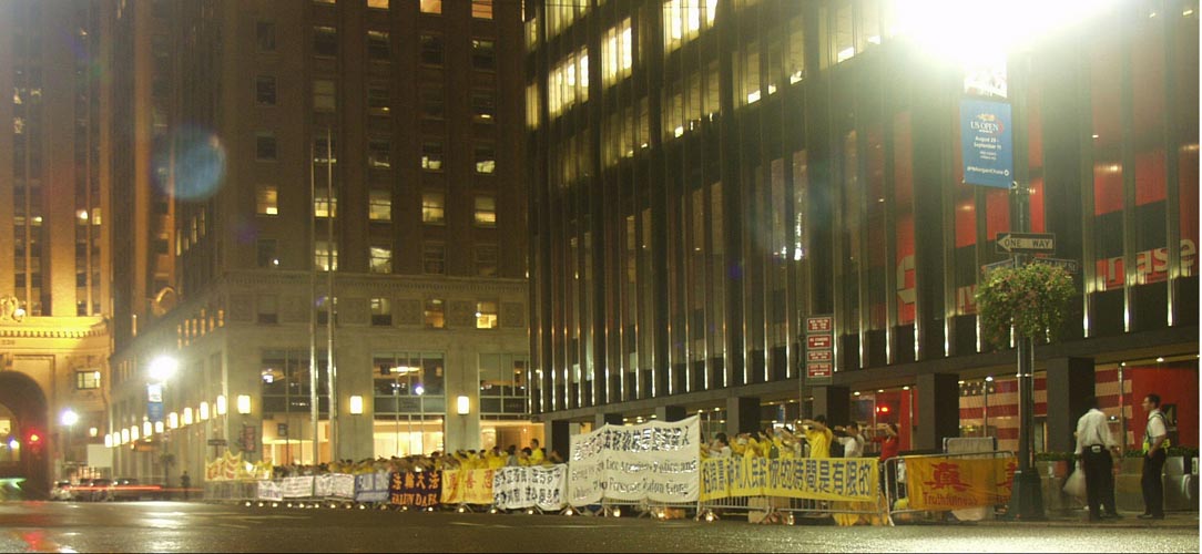 胡13日到达纽约时,新华网号称有5000人欢迎他,其实只有500人左右花钱买来的欢迎团。另一边法轮功的请愿才是真正的声势浩大。胡走的时候,“送”他的也只有法轮功学员。胡锦涛访问北美,法轮功学员一路奉陪。请愿的横幅在他所到之处纷纷展开。