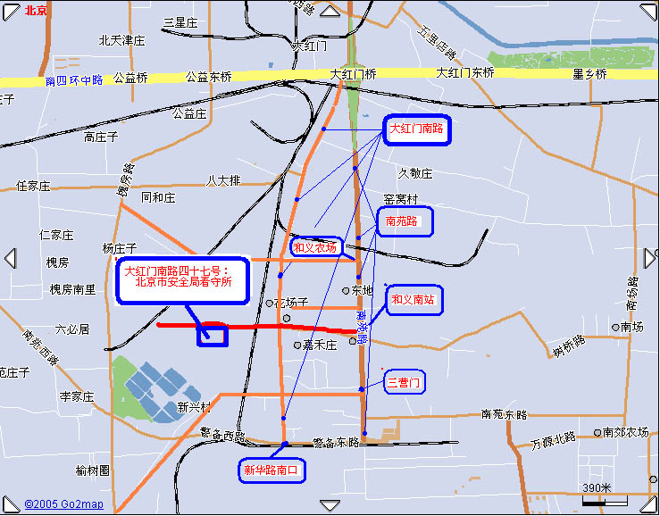 看守所位于大红门南路47号,参看地图,其路线为:从北京市大前门起,一直沿中轴路向南直到与南三环路交叉的木樨园(其间经过前门大街、永定门内大街、永定门外大街),再向南一直到与四环路交叉的大红门立交桥直至警备东路的东口为止(这一段则称为南苑路)。